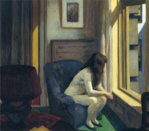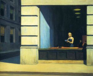 در واقع، یکی از سختترین سؤالها در فهم آثار هوپر این است که چگونه باید چهرۀ انسانها را در نقاشیهای او تفسیر کرد؟ روشن است که خوشحال و خندان نیستند، اما بهآسانی هم نمیتوان گفت که ماتمزده، خسته یا عصبیاند. گویا این شخصیتها اساساً واکنشی به دنیای پیرامونشان ندارند و به جایی دیگر خیره شدهاند. آدمهایی که وسط روز در فکر و خیالهای پوچ فرو رفتهاند و کل این شهر پرهیاهو چیزی ندارد که توجهشان را جلب کند.